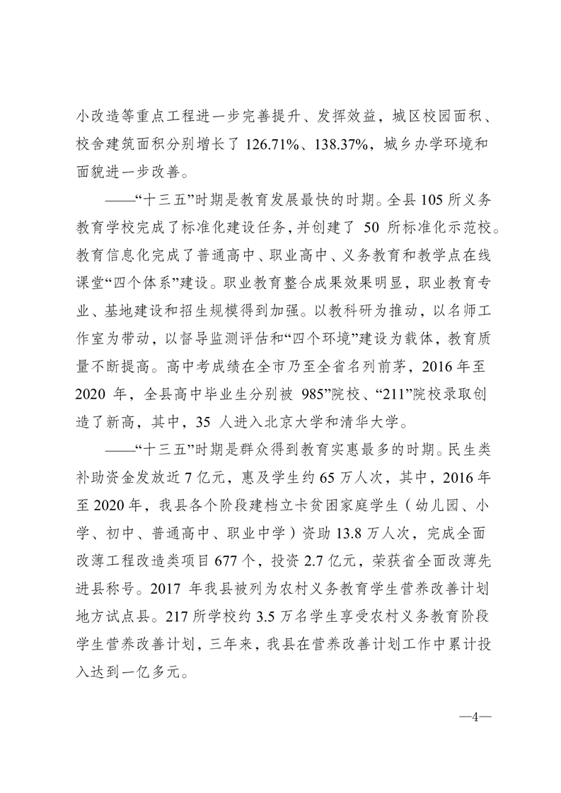 ——“十三五”時期是教育發(fā)展最快的時期。全縣105所義務教育學校完成了標準化建設任務,并創(chuàng)建了 50 所標準化示范校。教育信息化完成了普通高中、職業(yè)高中、義務教育和教學點在線課堂“四個體系”建設。職業(yè)教育整合成果效果明顯,職業(yè)教育專業(yè)、基地建設和招生規(guī)模得到加強。以教科研為推動,以名師工作室為帶動,以督導監(jiān)測評估和“四個環(huán)境”建設為載體,教育質(zhì)量不斷提高。高中考成績在全市乃至全省名列前茅,2016年至 2020 年,全縣高中畢業(yè)生分別被 985”院校、“211”院校錄取創(chuàng)造了新高,其中,35 人進入北京大學和清華大學。