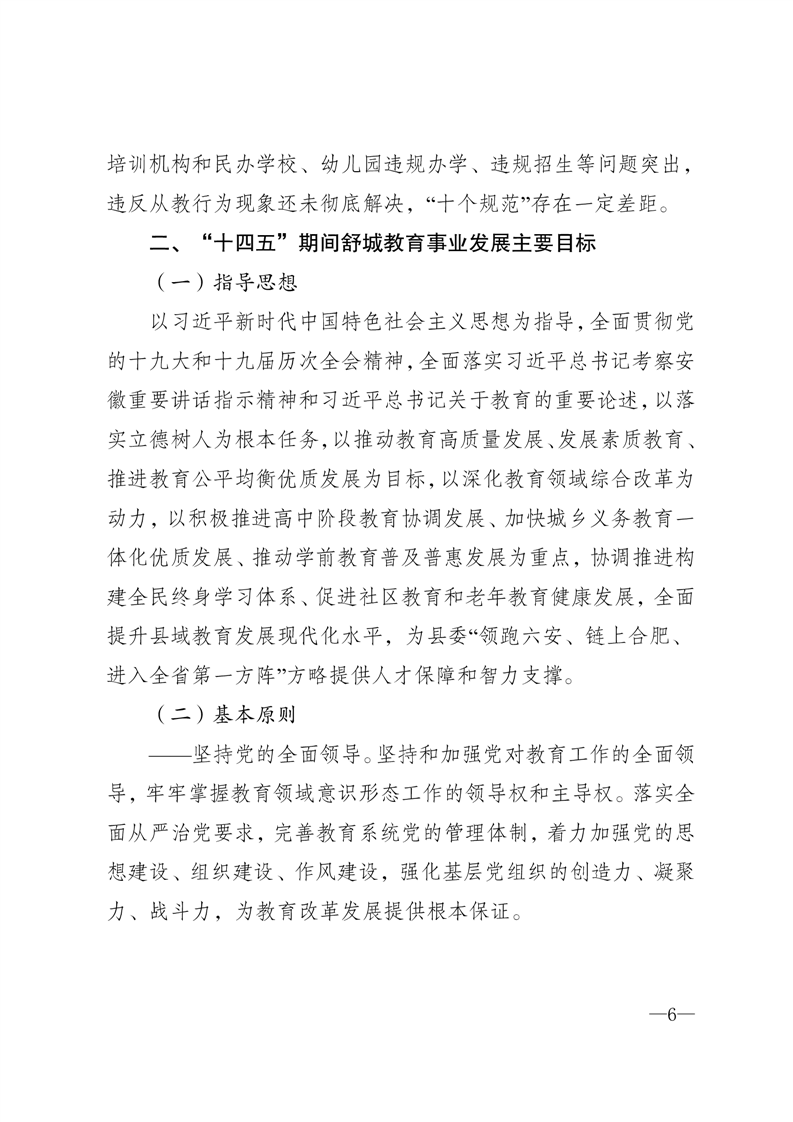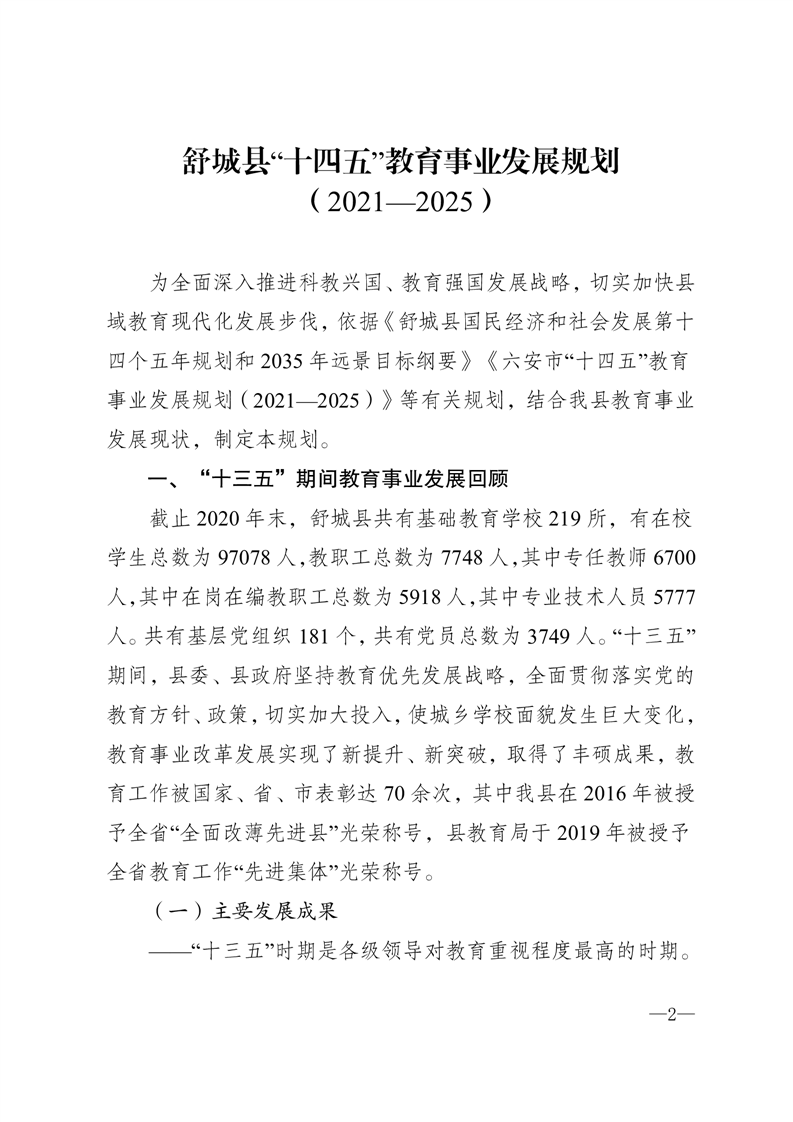 現(xiàn)將《舒城縣“十四五”教育事業(yè)發(fā)展規(guī)劃(2021—2025)》印發(fā)給你們,請認真貫徹落實。