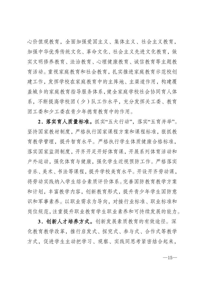 2.落實育人質(zhì)量標準。抓實“五大行動”,落實“五育并舉”。堅持國家教材制度,嚴格執(zhí)行國家課程方案和課程標準,狠抓教育教學管理,提升智育水平。嚴格執(zhí)行學生體質(zhì)健康合格標準,落實國家監(jiān)測制度,開齊開足開好體育課,開展系列體育活動和戶外運動,強化體育與健康,強化學生近視預防工作。嚴格落實音樂、美術(shù)、書法等課程,提升學校美育水平。開設開齊勞動課,將勞動實踐納入學生綜合素質(zhì)評價體系。完善國防教育教學方案和計劃,豐富教學內(nèi)容,創(chuàng)新教育形式,提升青少年學生國防意識和軍事素養(yǎng)。以職業(yè)需求為導向,對接行業(yè)標準、職業(yè)標準和崗位規(guī)范,注重提升職業(yè)教育學生職業(yè)素養(yǎng)和可持續(xù)發(fā)展的能力。