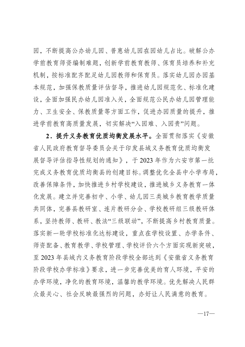 2.提升義務教育優(yōu)質(zhì)均衡發(fā)展水平。全面貫徹落實《安徽省人民政府教育督導委員會關(guān)于印發(fā)縣域義務教育優(yōu)質(zhì)均衡發(fā)展督導評估指導性規(guī)劃的通知》,于2023年作為六安市第一批完成義務教育優(yōu)質(zhì)均衡縣的創(chuàng)建目標。調(diào)整優(yōu)化全縣中小學布局,改善保障條件,加快推進鄉(xiāng)村學校建設,推進城鄉(xiāng)義務教育一體化發(fā)展。建立并完善初中、小學、幼兒園三類城鄉(xiāng)教育教學質(zhì)量共同體,完善縣教研室、連片教研分會、學校教研組三級教研體系,堅持教師、教研、教法“三級聯(lián)動”,不斷提高鄉(xiāng)村教育質(zhì)量。落實新一輪學校標準化達標建設,重點在學校設置、辦學條件、師資配備、教育教學、學校管理、學校評價六個方面實現(xiàn)新突破,至2023年縣域內(nèi)義務教育階段學校全部達到《安徽省義務教育階段學校辦學標準》要求,進一步完善優(yōu)美的育人環(huán)境,平安的辦學環(huán)境,凈化的教育環(huán)境,溫馨的教學環(huán)境。優(yōu)先解決人民群眾最關(guān)心、社會反映最強烈的問題,辦好讓人民滿意的教育。