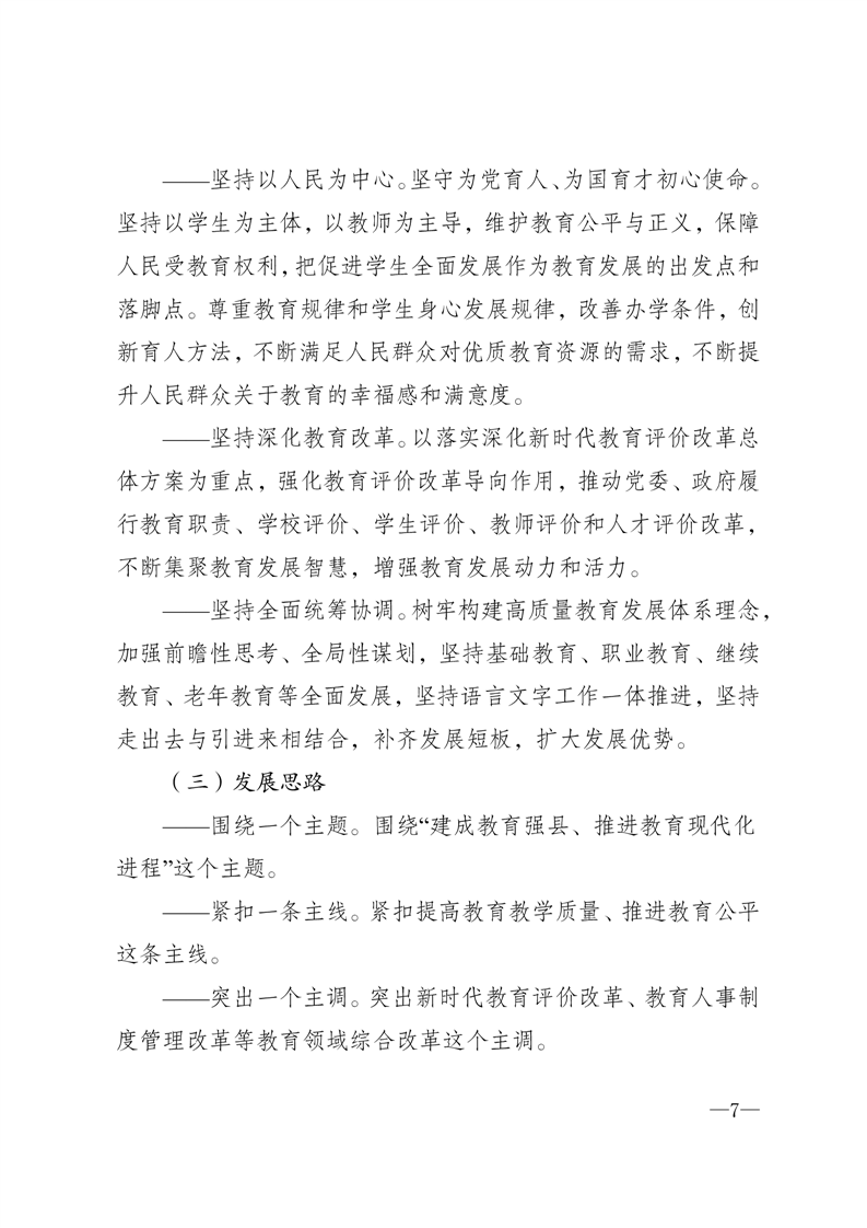 以習近平新時代中國特色社會主義思想為指導,全面貫徹黨的十九大、十九屆歷次全會和黨的二十大精神,全面落實習近平總書記考察安徽重要講話指示精神和習近平總書記關(guān)于教育的重要論述,以落實立德樹人為根本任務,以推動教育高質(zhì)量發(fā)展、發(fā)展素質(zhì)教育、推進教育公平均衡優(yōu)質(zhì)發(fā)展為目標,以深化教育領(lǐng)域綜合改革為動力,以積極推進高中階段教育協(xié)調(diào)發(fā)展、加快城鄉(xiāng)義務教育一體化優(yōu)質(zhì)發(fā)展、推動學前教育普及普惠發(fā)展為重點,協(xié)調(diào)推進構(gòu)建全民終身學習體系、促進社區(qū)教育和老年教育健康發(fā)展,全面提升縣域教育發(fā)展現(xiàn)代化水平,為縣委“領(lǐng)跑六安、鏈上合肥、進入全省第一方陣”方略提供人才保障和智力支撐。