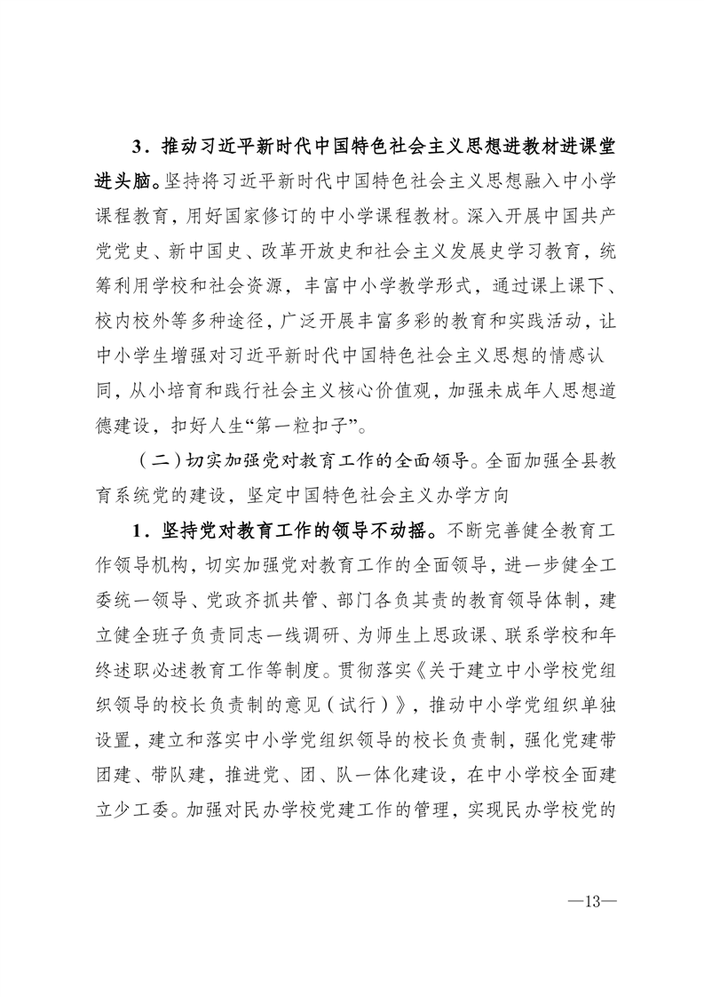 (二)切實加強黨對教育工作的全面領(lǐng)導。全面加強全縣教育系統(tǒng)黨的建設,堅定中國特色社會主義辦學方向。