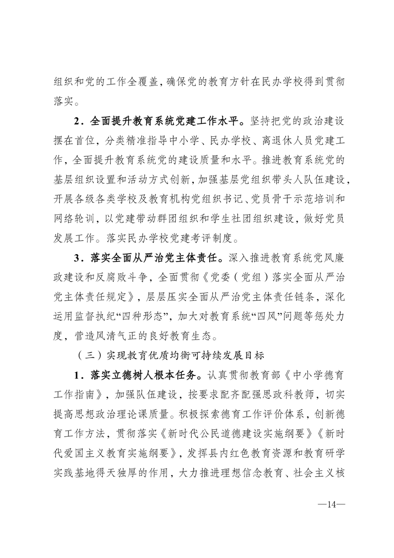 “十四五”時期是我縣高質(zhì)量發(fā)展的戰(zhàn)略機遇期,也是我縣教育事業(yè)高質(zhì)量發(fā)展的關(guān)鍵階段。教育工作要找準縣域經(jīng)濟社會發(fā)展戰(zhàn)略地位,對接各類發(fā)展戰(zhàn)略規(guī)劃,主動服務經(jīng)濟社會發(fā)展,努力滿足人民群眾對優(yōu)質(zhì)教育資源的需求,著重從十個方面推動落實教育重點工作任務,實現(xiàn)縣域教育現(xiàn)代化發(fā)展目標。