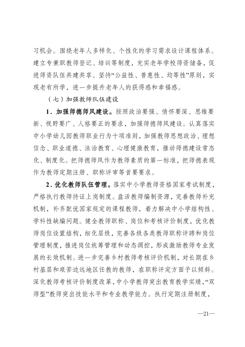 2.優(yōu)化教師隊伍管理。落實中小學教師資格國家考試制度,嚴格執(zhí)行教師持證上崗制度。盤活教師編制資源,完善教師補充機制,補齊配優(yōu)國家規(guī)定的課程教師,著力解決中小學結(jié)構(gòu)性、學科性缺編問題。健全教師職稱、崗位和考核評價制度,優(yōu)化教師崗位設置結(jié)構(gòu),細化層級,完善各級各類教師職稱評聘和崗位管理制度,推進崗位統(tǒng)籌管理和動態(tài)調(diào)控,形成激勵教師專業(yè)發(fā)展的長效機制。進一步完善鄉(xiāng)村教師考核評價機制,對長期在鄉(xiāng)村基層和艱苦邊遠地區(qū)任教的教師,在職稱評定方面予以傾斜。深化教師考核評價制度改革,中小學教師突出教育教學實績,“雙師型”教師突出技能水平和專業(yè)教學能力。執(zhí)行定期注冊制度,建立健全教師退出機制,提升教師隊伍整體活力。深入實施中小學教師“縣管校聘”改革,推進縣域內(nèi)師資均衡配置和教師、校長定期交流。加大優(yōu)秀人才引進力度,建立健全吸引優(yōu)秀人才從教的引進機制。