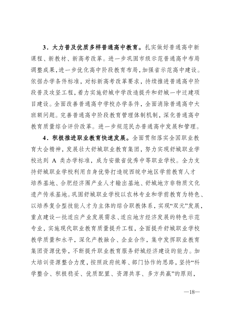 3.大力普及優(yōu)質(zhì)多樣普通高中教育。扎實做好普通高中新課程、新教材、新高考改革。進一步鞏固市級示范普通高中布局調(diào)整成果,進一步優(yōu)化高中階段教育布局,加強省示范高中建設。依據(jù)辦學條件標準,對標新高考改革要求,持續(xù)推進普通高中階段普及攻堅工程,著力實施舒城中學改造提升和舒城一中遷建項目建設。全面改善普通高中學校辦學條件,全面消除普通高中大班額問題。完善普通高中階段教育管理體制機制,深化普通高中教育質(zhì)量綜合評價改革。進一步規(guī)范民辦普通高中發(fā)展和管理。