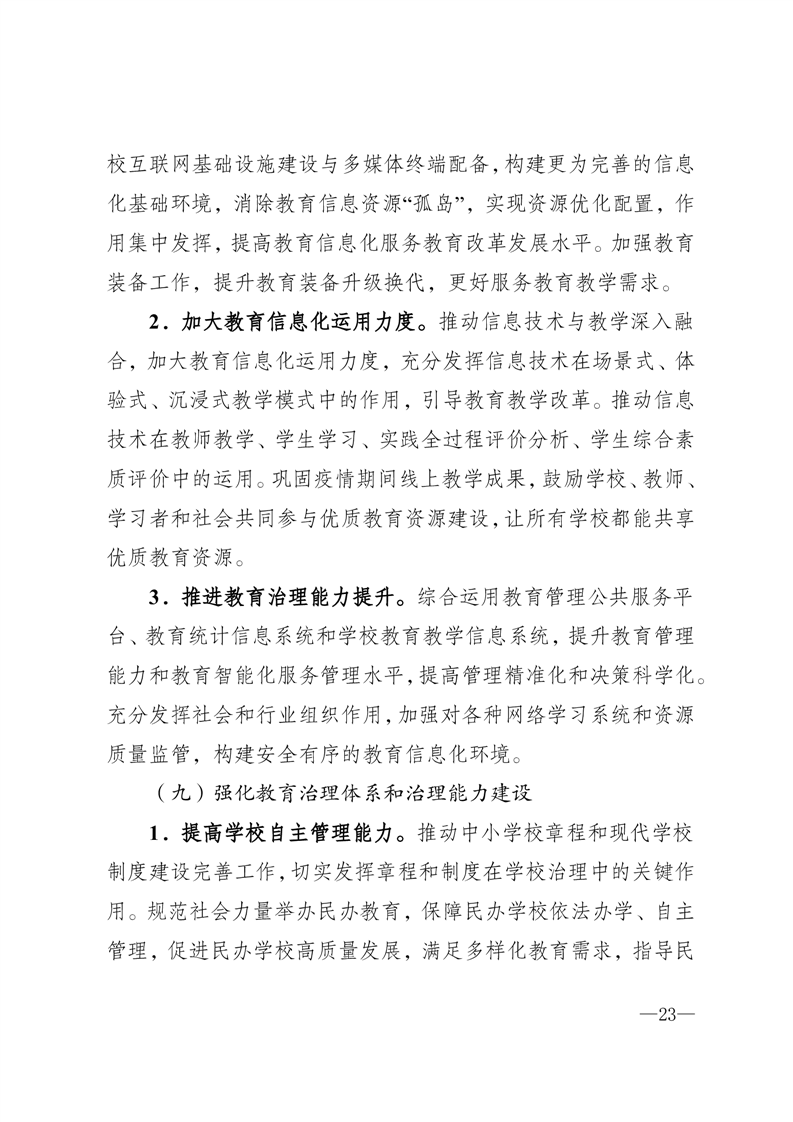 2.加大教育信息化運用力度。推動信息技術(shù)與教學深入融合,加大教育信息化運用力度,充分發(fā)揮信息技術(shù)在場景式、體驗式、沉浸式教學模式中的作用,引導教育教學改革。推動信息技術(shù)在教師教學、學生學習、實踐全過程評價分析、學生綜合素質(zhì)評價中的運用。鞏固疫情期間線上教學成果,鼓勵學校、教師、學習者和社會共同參與優(yōu)質(zhì)教育資源建設,讓所有學校都能共享優(yōu)質(zhì)教育資源。