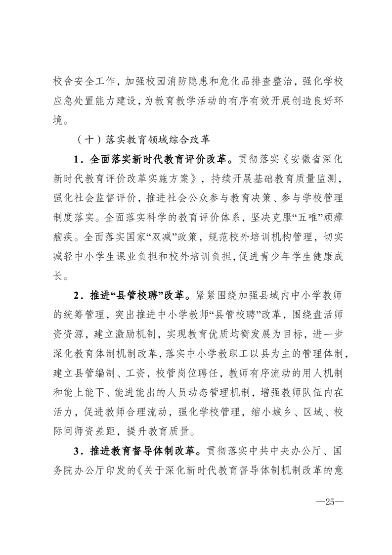 1.全面落實新時代教育評價改革。貫徹落實《安徽省深化新時代教育評價改革實施方案》,持續(xù)開展基礎(chǔ)教育質(zhì)量監(jiān)測,強化社會監(jiān)督評價,推進社會公眾參與教育決策、參與學校管理制度落實。全面落實科學的教育評價體系,堅決克服“五唯”頑瘴痼疾。全面落實國家“雙減”政策,規(guī)范校外培訓機構(gòu)管理,切實減輕中小學生課業(yè)負擔和校外培訓負擔,促進青少年學生健康成長。