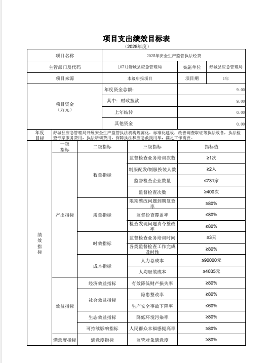 舒城縣應(yīng)急管理局2025年項(xiàng)目支出績(jī)效目標(biāo)表