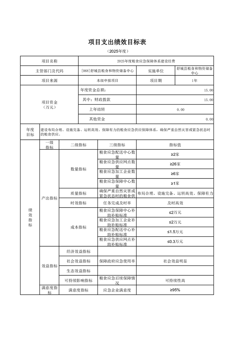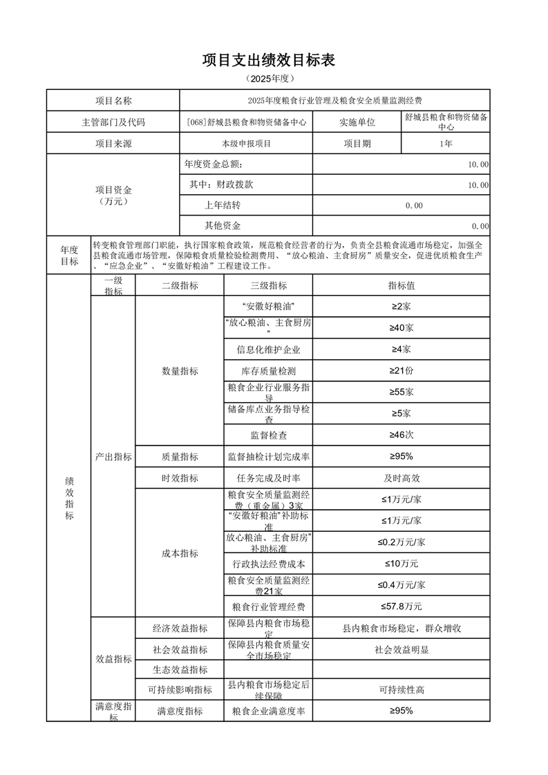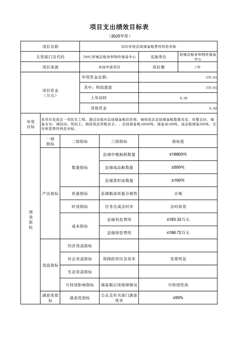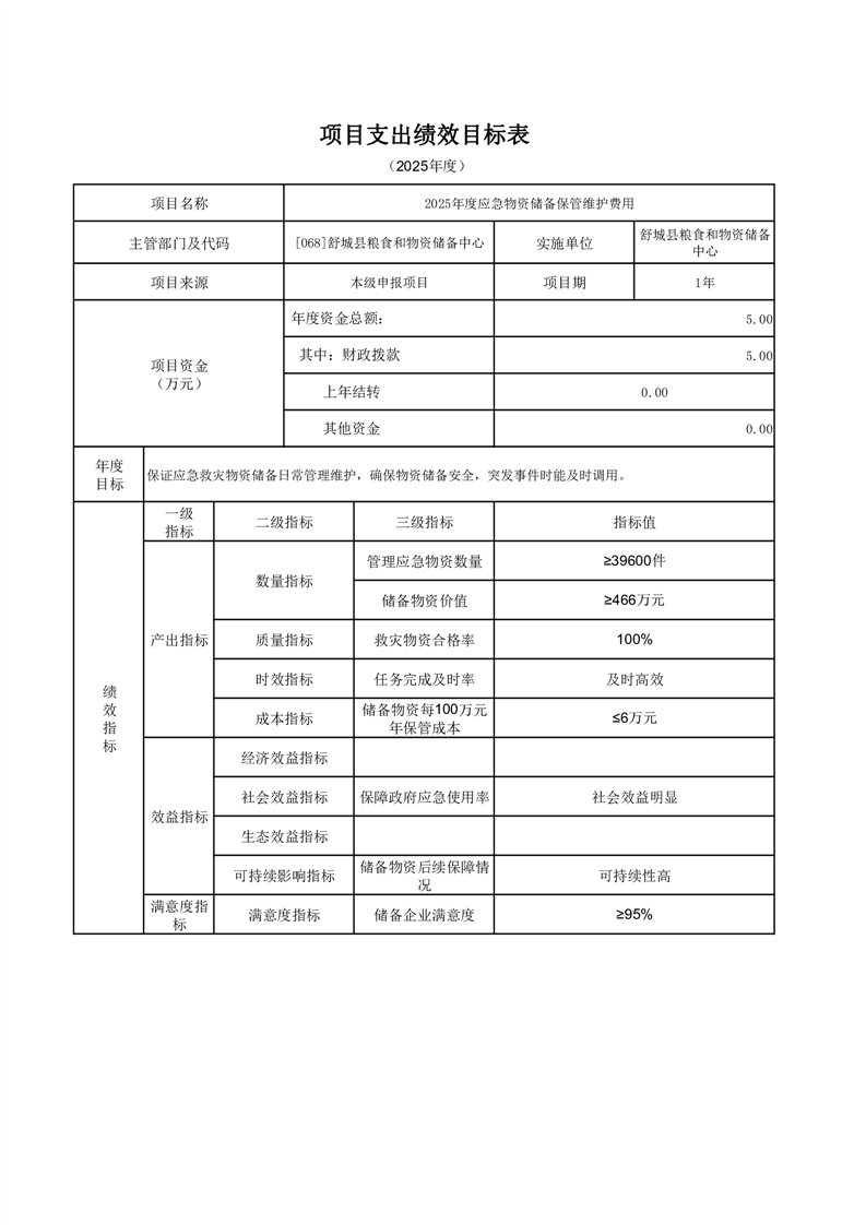 舒城縣糧食和物資儲(chǔ)備中心2025年度部門項(xiàng)目支出績效目標(biāo)表