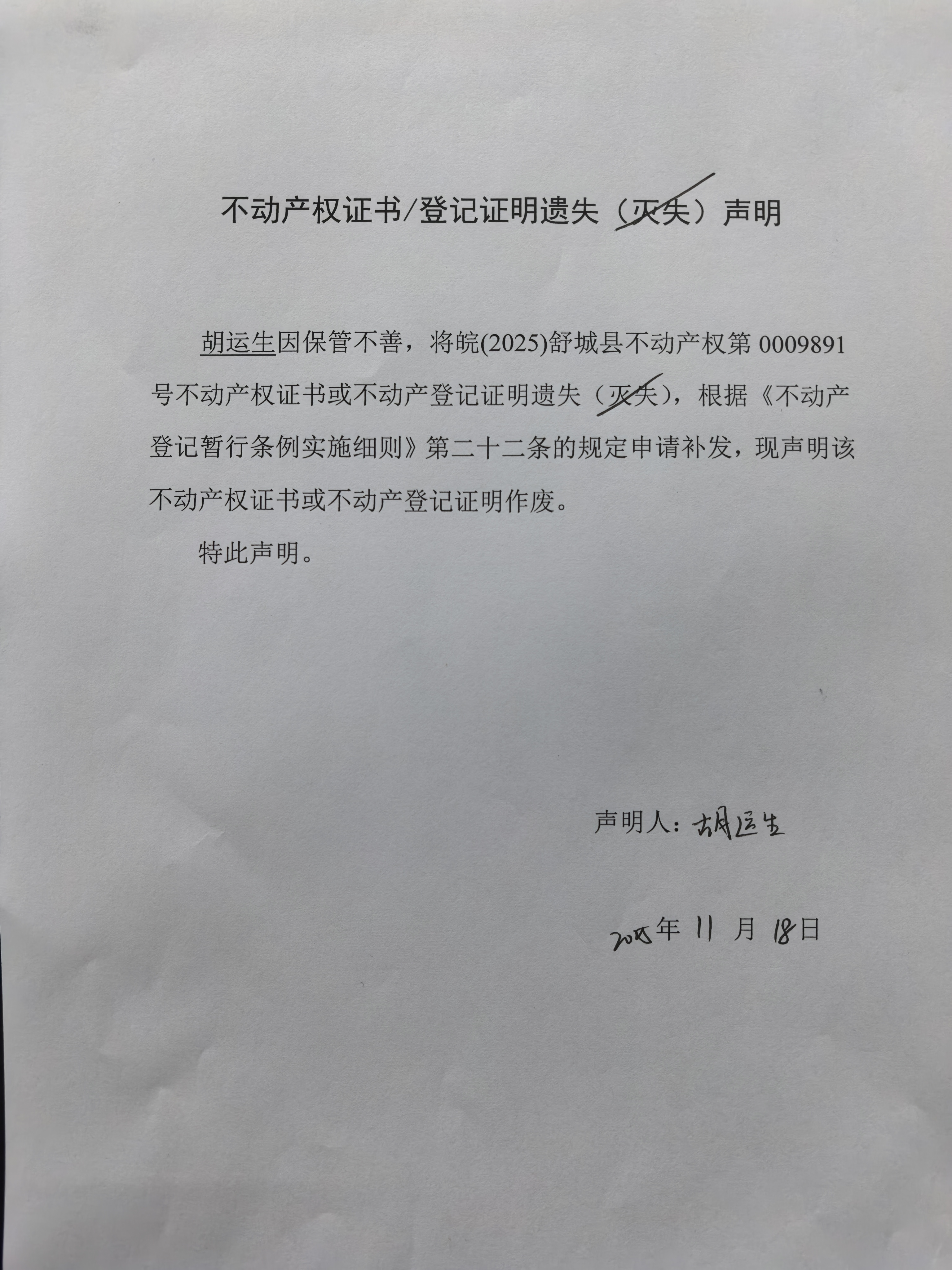關(guān)于胡運(yùn)生不動(dòng)產(chǎn)權(quán)證書(shū)遺失聲明公告