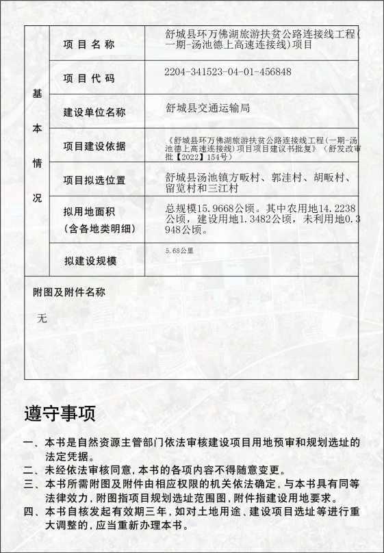 舒城縣環(huán)萬佛湖旅游扶貧公路連接線工程(一期-湯池德上高速連接線)項目用地預審和選址意見書