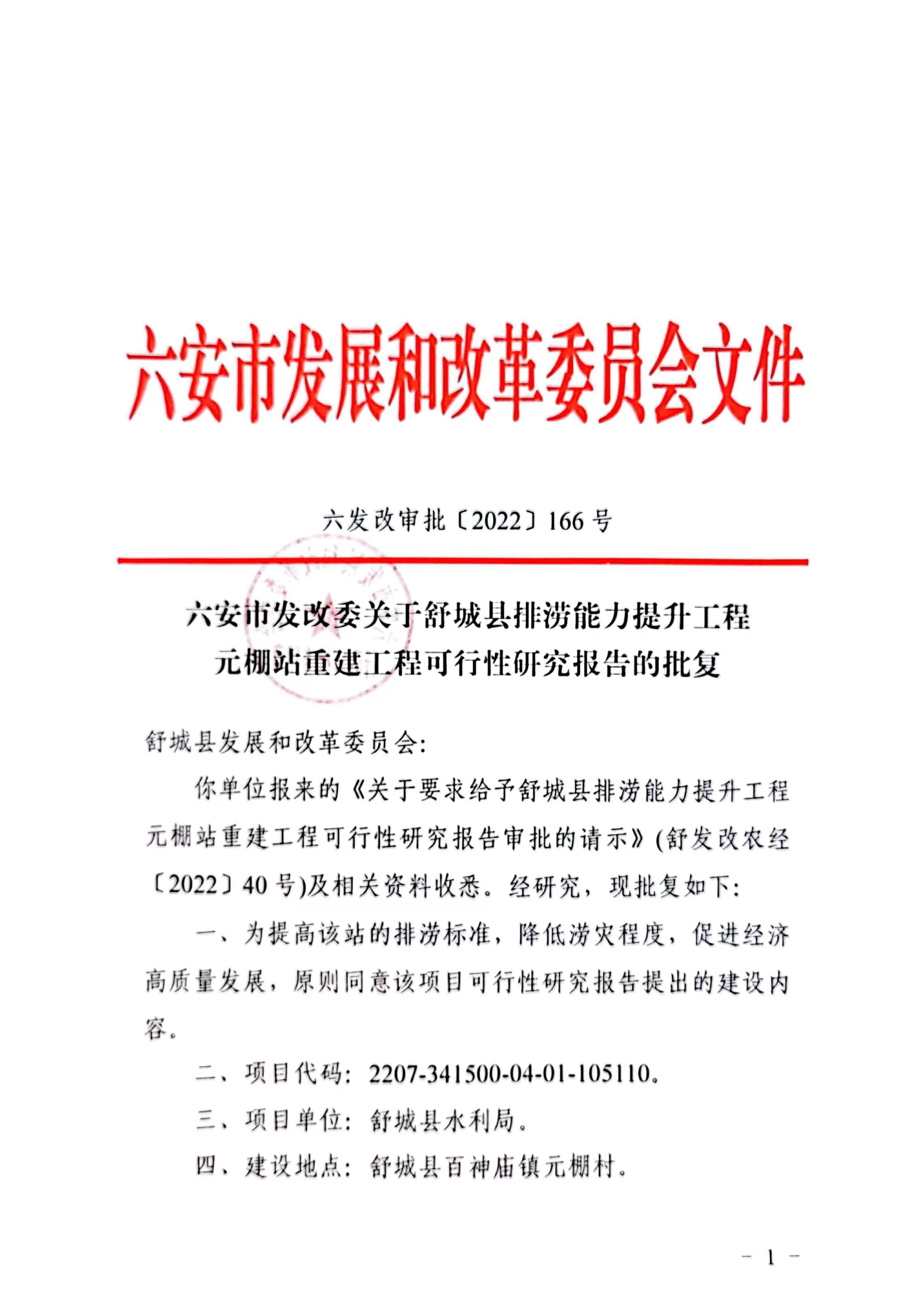 舒城縣排澇能力提升工程元棚站重建工程可行性研究報告的批復(fù)