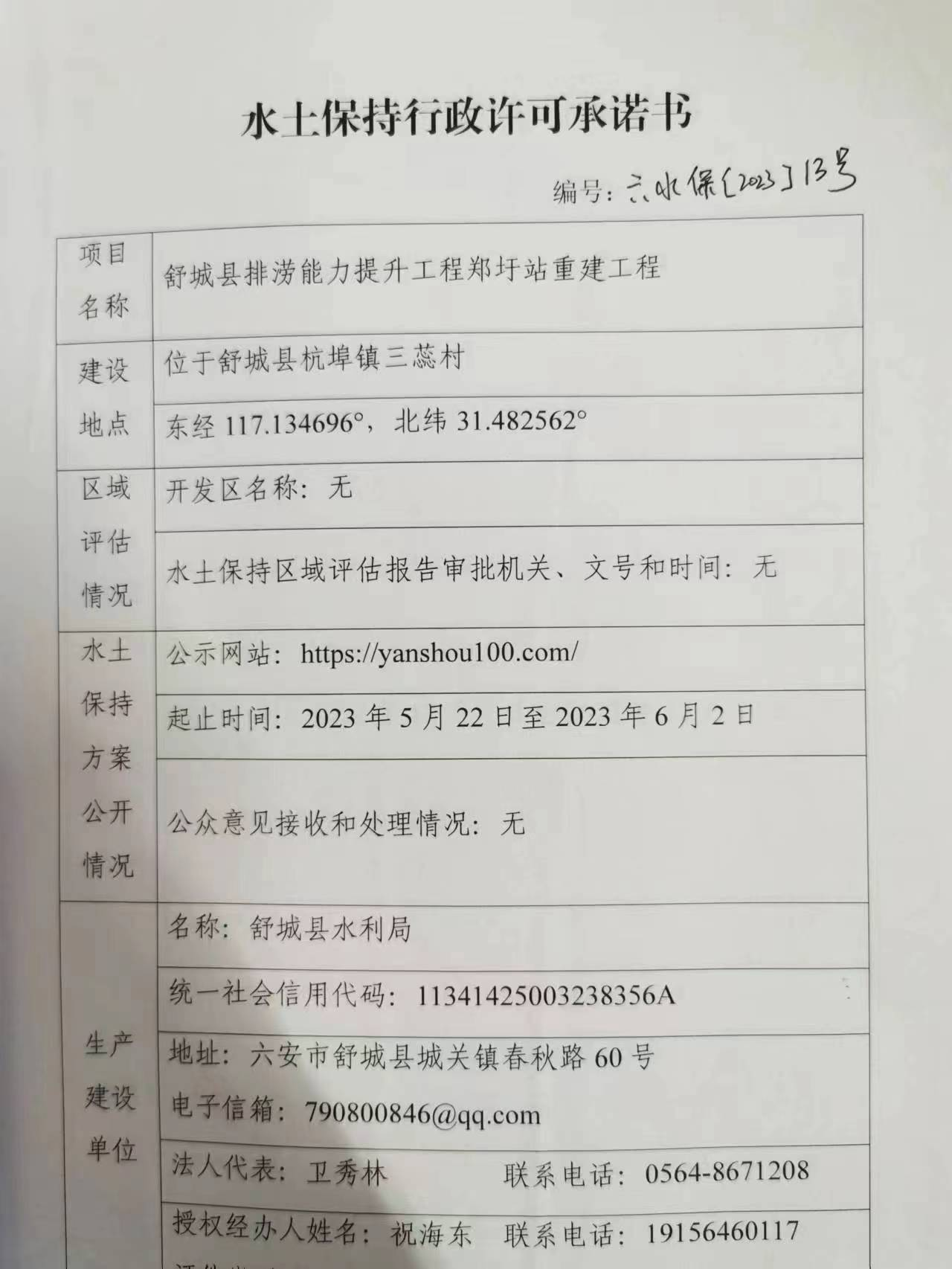 舒城縣排澇能力提升工程鄭坪站重建工程水土保持行政許可承諾書
