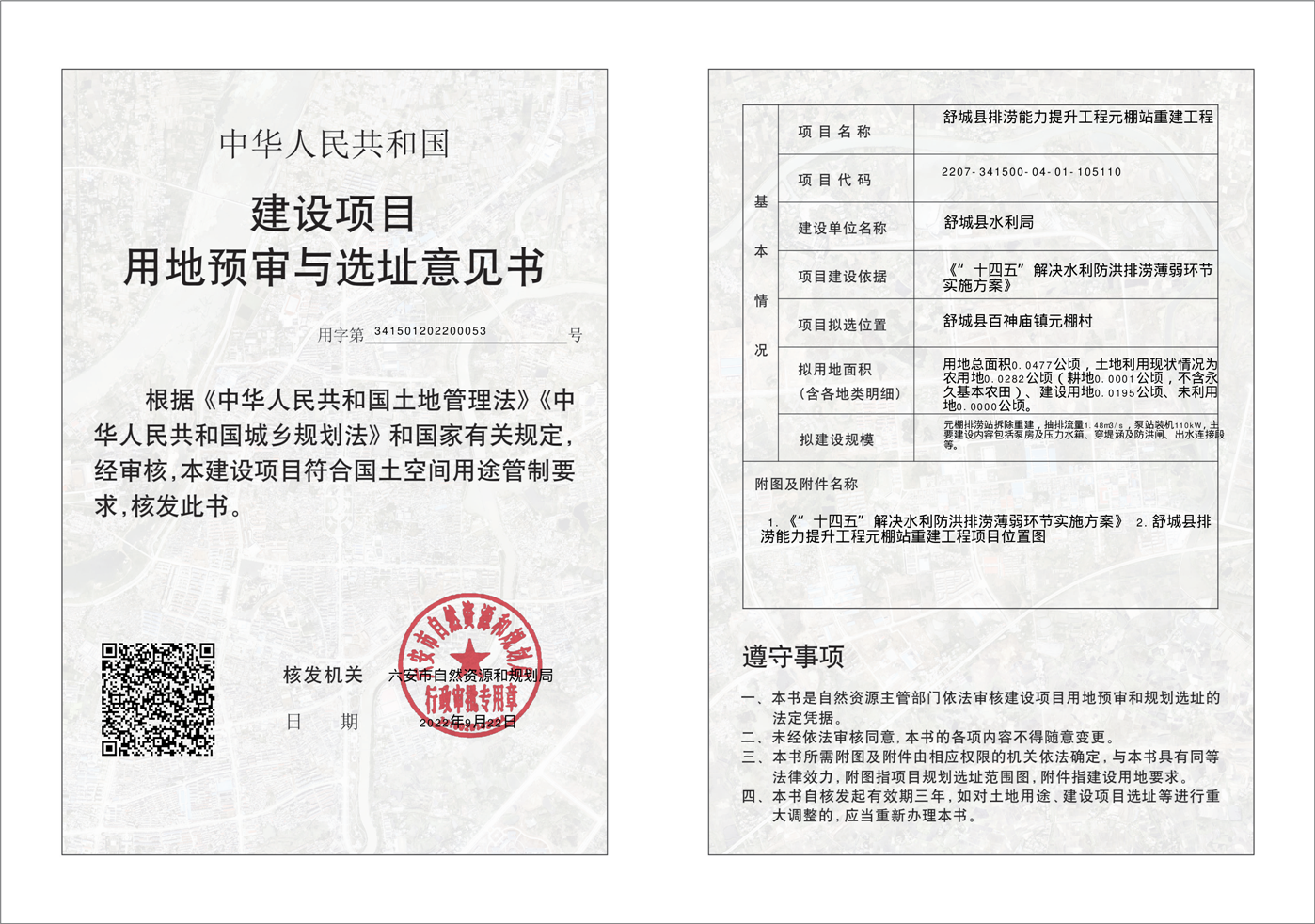 舒城縣排澇能力提升工程元棚站重建工程建設(shè)項(xiàng)目選址意見審批結(jié)果