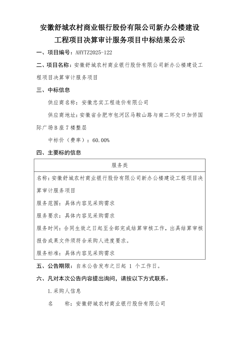 安徽舒城農(nóng)村商業(yè)銀行股份有限公司新辦公樓建設(shè)工程項目決算審計服務(wù)項目中標結(jié)果公示