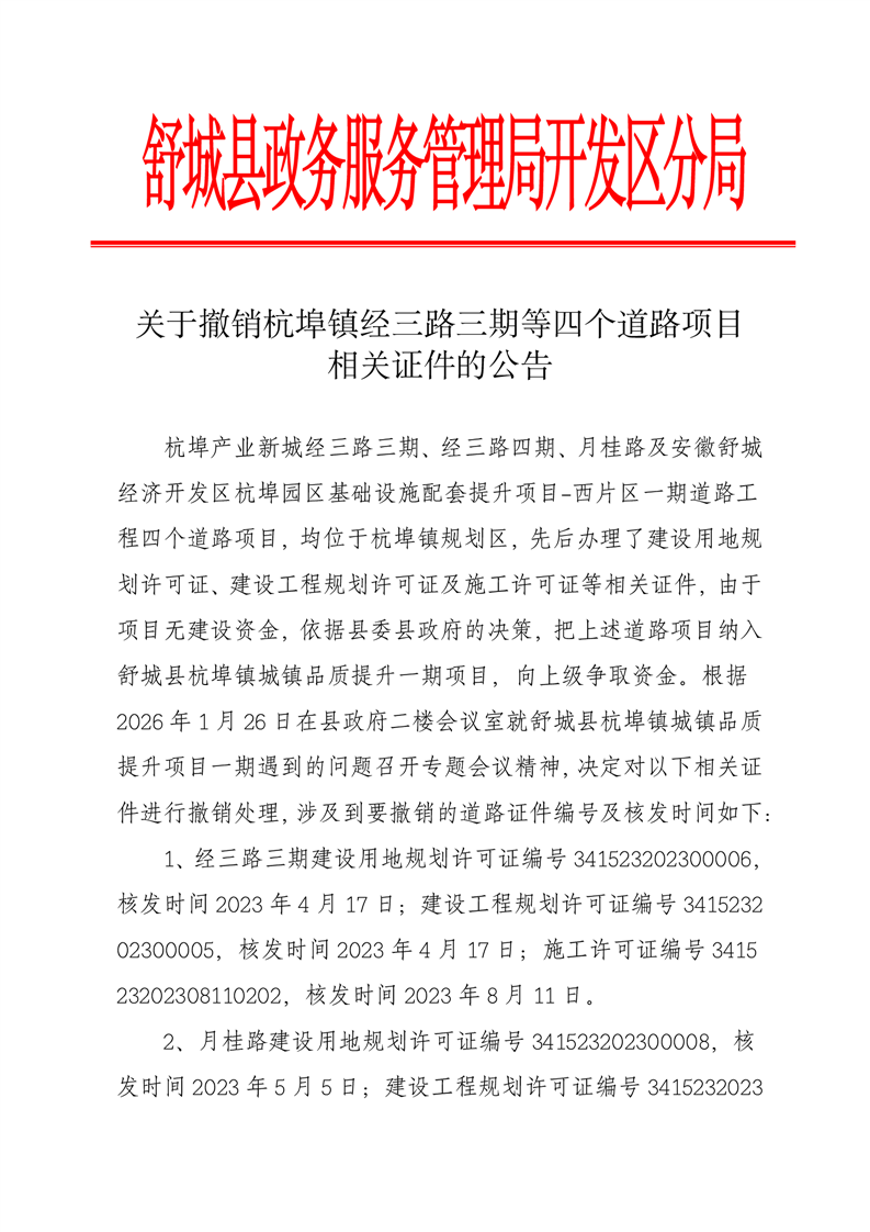 關(guān)于撤銷杭埠鎮(zhèn)經(jīng)三路三期等四個道路項(xiàng)目相關(guān)證件的公告