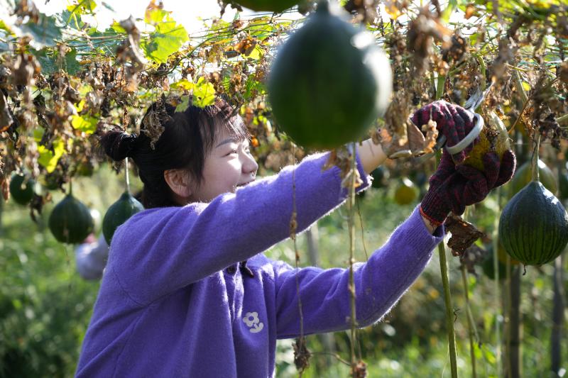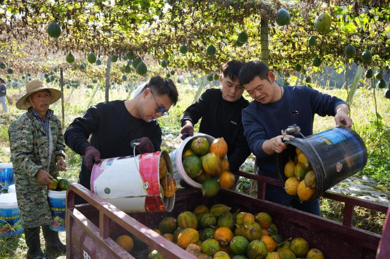 介紹結(jié)束后,青年干部們便投入瓜蔞采摘環(huán)節(jié),30余人手持采摘工具,在技術(shù)員指導(dǎo)下學(xué)習(xí)瓜蔞成熟度判斷技巧和采摘方法,迅速投入狀態(tài)。田間地頭頓時(shí)忙碌起來(lái),他們分工協(xié)作、相互配合,弓著腰穿梭在藤蔓間,小心摘下金黃色的瓜蔞果,豐收的喜悅洋溢在每個(gè)人的臉上。經(jīng)過(guò)一上午的努力,共采摘瓜蔞6000余斤,青年干部小柴擦拭著額頭的汗水說(shuō):“第一次親手采摘瓜蔞,才真正理解‘粒粒皆辛苦’的含義?!?/p>